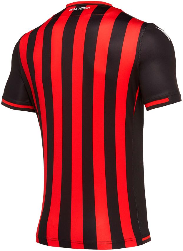 ニースのホームキットといえば、レッドとブラックの2色で彩る垂直ストライプがおなじみ。細部に目を向けると、ここ数年は襟付き・ボタン止めのスタイルを採用していたが、今季はシンプルにラップオーバーの浅めのVネックに変更となった。