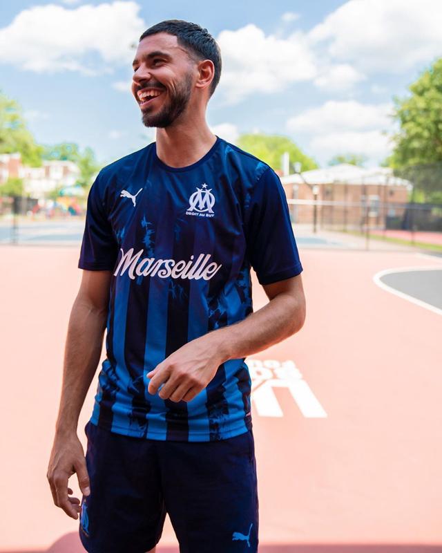 インフルエンス・ジャージのブルーはネイビーを基調としたストライプ柄。この色とデザインは従来のマルセイユのユニフォームに近い印象を受ける。公式のゲームシャツではないので、胸には街の名前「Marseille」をプリント。