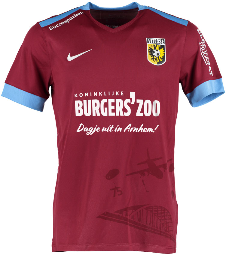 アウェイユニフォームはワインレッド系の色をメインカラー。前身頃には、第二次世界大戦を描いた映画「遠すぎた橋」の舞台にもなったジョン・フロスト橋を描く。