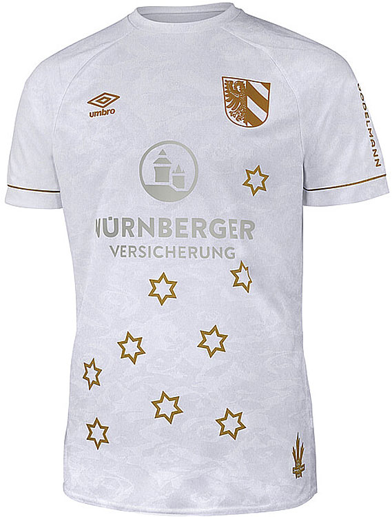 今回の左胸のエンブレムは、通常のチームクレストではなくニュルンベルク市の紋章。キットは雪を連想させるホワイトを基調に、華やかなゴールドの差し色で統一する。
