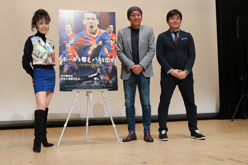 舞台挨拶として熱狂的なバルセロナ・ファンとして知られる歌手の小柳ルミ子さん、サッカー解説者で元日本代表の川勝良一さん、そして、スポーツ専門チャンネル「J SPORTS」のプロデューサー菅原慎吾さんが登壇。