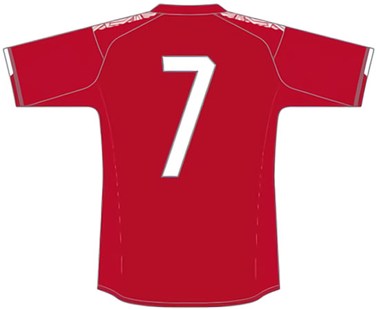 たすき部分のチームカラーがレッドからホワイトに移り変わるグラデーションは、チームの進化と繁栄を表現。胸元のエンブレムの上には、今までに獲得したタイトルの数を星で表している。