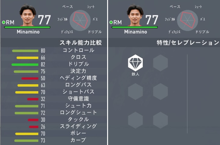 メインポジションはCAM(攻撃的MF)からRM(右サイドハーフ)に変更。総合値は75から77にアップしたが、守備値は下がっている。