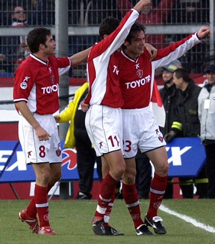 ガウッチ氏、ペルージャ、日本の三者を結んだ最後のユニフォームとなった2003-04モデル。そして、その前シーズンの2002-03モデル。この2シーズンで胸スポンサーだったのは日本企業の「TOYOTA(トヨタ自動車)」だった。なお、クラブは03-04シーズンの成績によりセリエBへ降格している。
