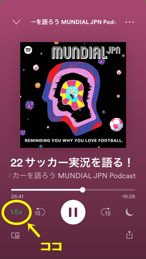 Spotifyで目当てのポッドキャストの再生を始めたら、左下のココをタップ。