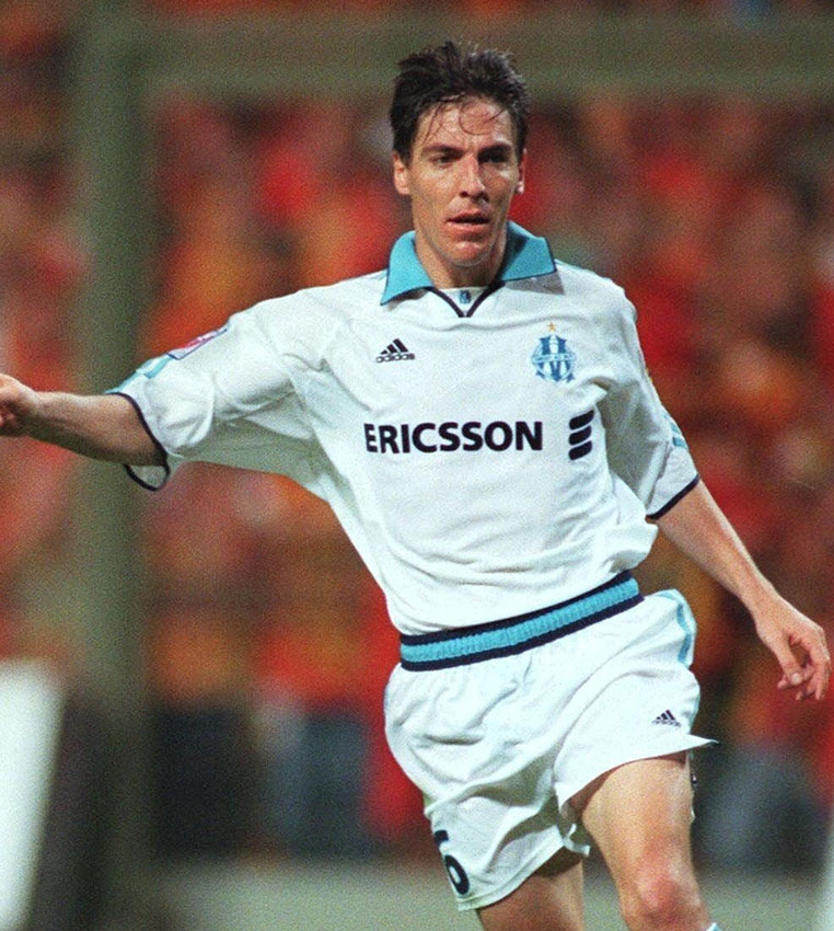 酒井宏樹が所属するマルセイユ。白を基調にブルーが美しい、シンプルなデザインの99-00モデル。当時の胸スポンサー「ERICSSON」も人気の高いロゴマークだった。