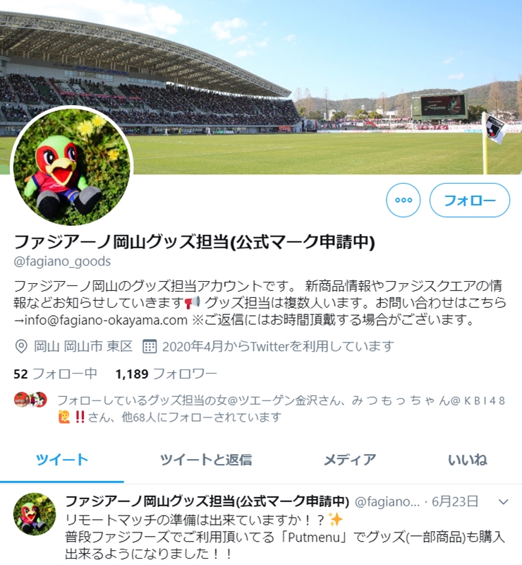 私が把握している中でも、我がファジアーノ岡山を含め6クラブがこのコロナ中断期間に「グッズ担当アカウント」を新規開設しています。
