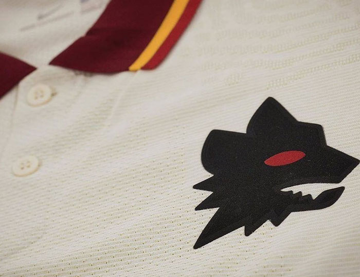 ベージュを基調に、襟にはジャッロロッソ(黄と赤)のアクセントカラー。このスタイルは80年代初頭のアウェイキットに見られた。また、今回のエンブレムは当時と同様に狼を模ったデザインを使う。