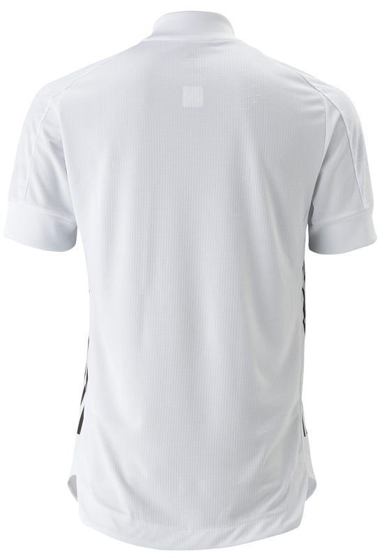 襟は着た際に立ち上がるVネックを採用することで、洗練されたスタイリッシュなデザインを追求。選手名と背番号、脇のスリーストライプスは黑、袖はリブ仕立てとなっている。