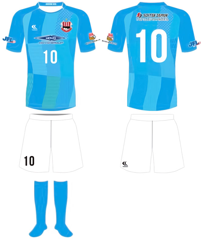 アウェイはブルーを基調としたデザイン。各部スポンサーについては、胸部が「豊洋精工(株)」、背中が「ソイテックスジャパン(株)」で継続する。