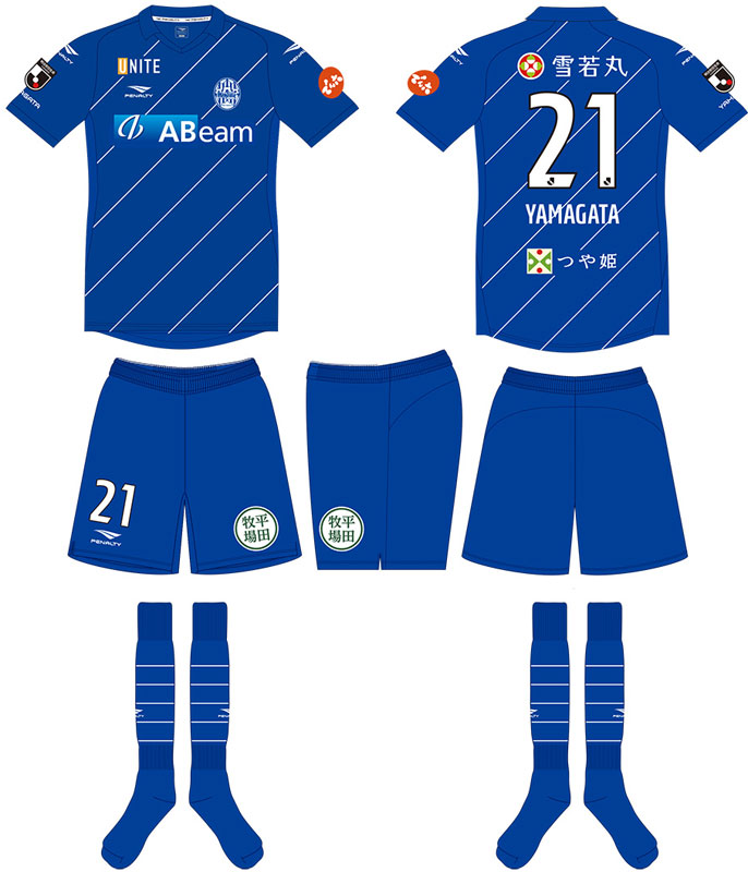 ホームユニフォームのデザインは、モンテディオ山形の象徴であるブルーを基調。ホワイトのストライプを斜めに走らせ、これまでの山形のイメージとは異なる新しいデザインに仕上げている。