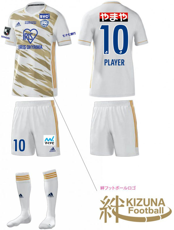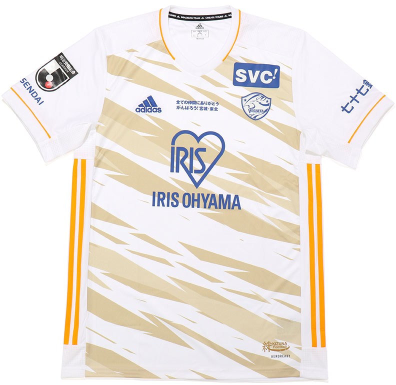 アウェイはホワイトを基調にゴールドの差し色というデザイン。グラフィックはホームと共通で「希望の光よ、もう一度」がコンセプトで、東日本大震災から10年を迎えることから胸部にメッセージを刻む。