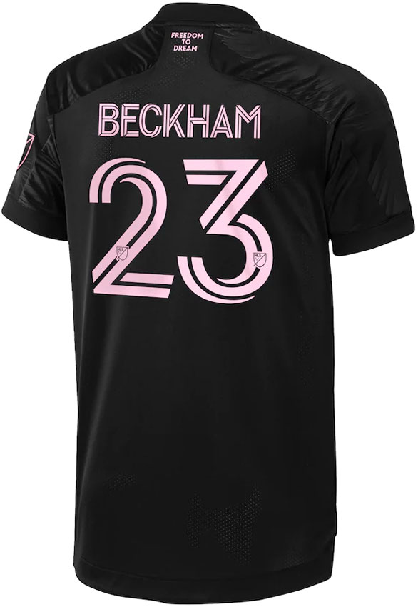 背面には“FREEDOM TO DREAM”をレタリング。ネームナンバーにもピンクを用いる。ベッカム会長のネームナンバーも販売中!