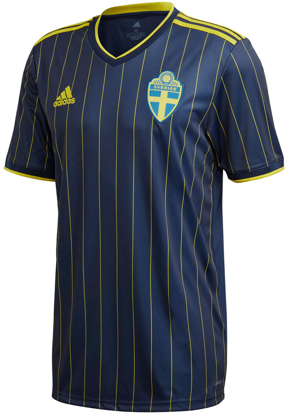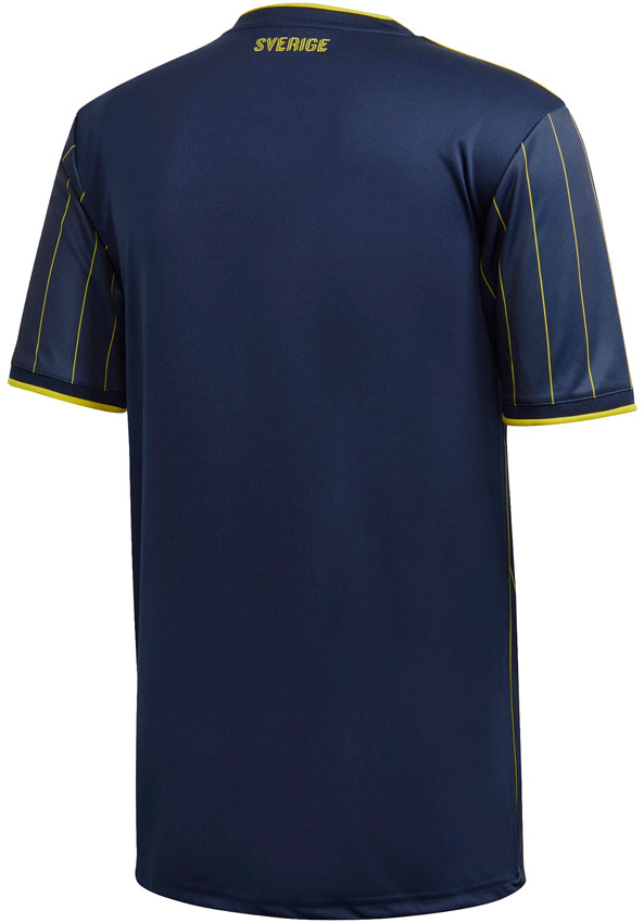 新アウェイユニフォームはダークブルーをベースに、首周りやピンストライプをイエローで彩る。襟はVネックを採用し、全体的にすっきりとしたデザイン。色使いにスウェーデンらしさを感じられ、シンプルで格好良い一着に仕上がっている。
