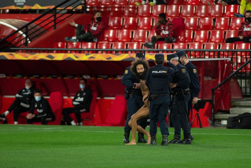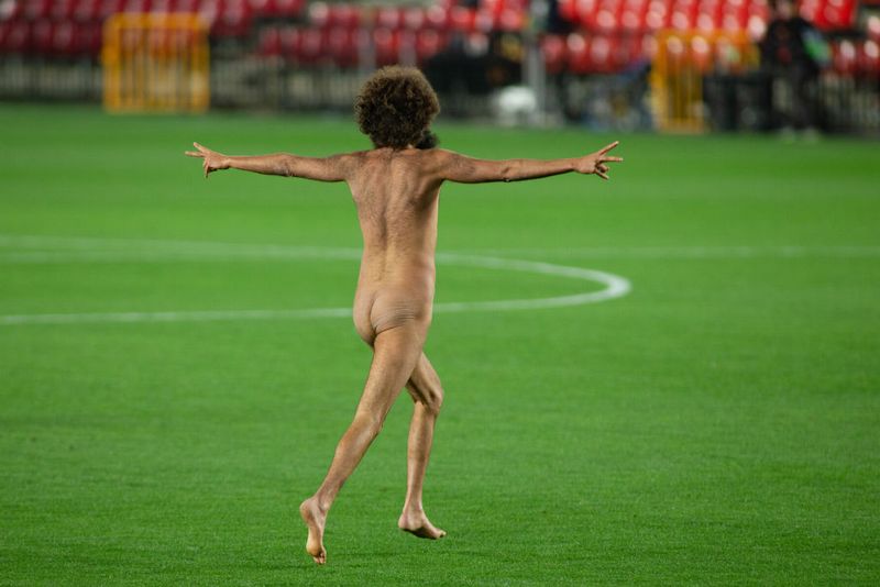 そんな試合で大きな話題になってしまったのが、なぜかサポーターの入場を許可していない試合だったにもかかわらずピッチに乱入してきた全裸アフロの男性だった。