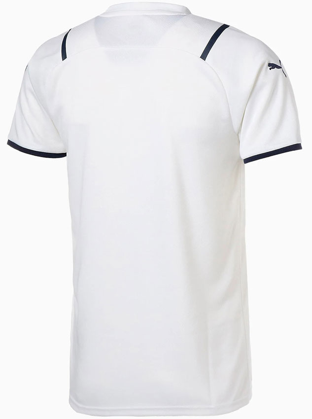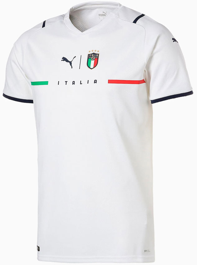 新アウェイユニフォームは胸中央にメーカーロゴ(Pumaキャット)とエンブレムを配し、その下には国名“ITALIA”をレタリングする。一般的な代表チームのイメージから大きくかけ離れたもので、Pumaの新機軸とでもいうべき斬新なデザインとなっている。