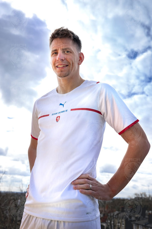 ホワイトを基調に、レッドのストライプとブルーのキャットロゴ。アウェイユニフォームはチェコ国旗の3色で構成されている。