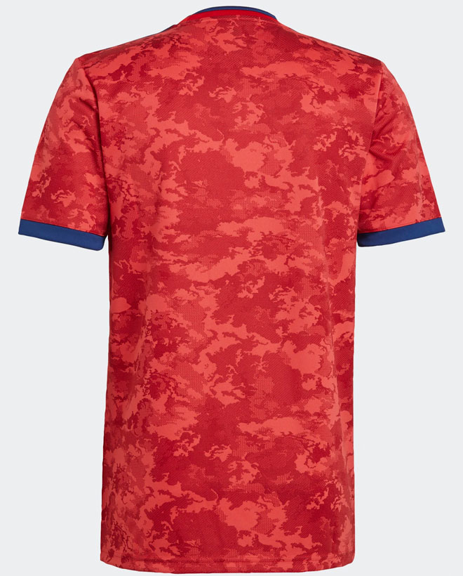 新アウェイユニフォームは、レッドを基調にカモフラージュ柄をあしらったデザインを採用。スリーストライプスなどの差し色にブルーを配する。
