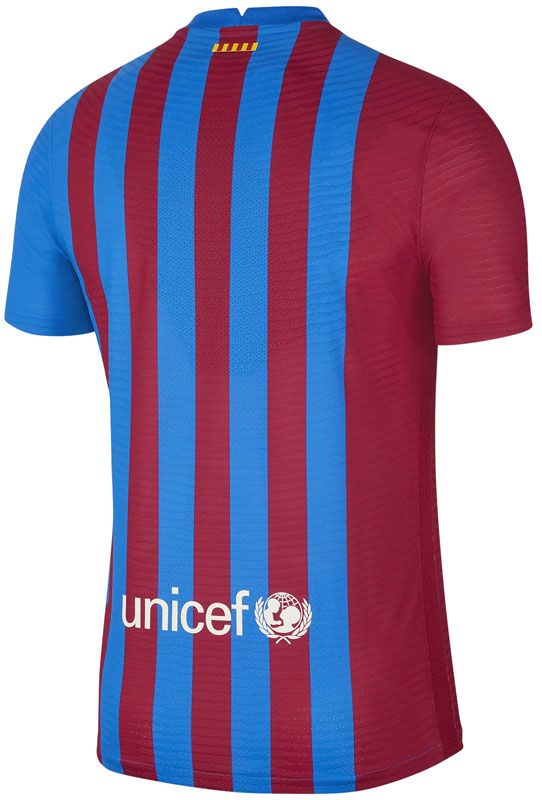 背面首元にはクラブのアイデンティティとも言えるカタルーニャ州旗を装着。キットカラーは伝統のブラウグラナ(青と臙脂)なのだが、明度や彩度といった色合いがこれまでとは異なる印象を受ける。