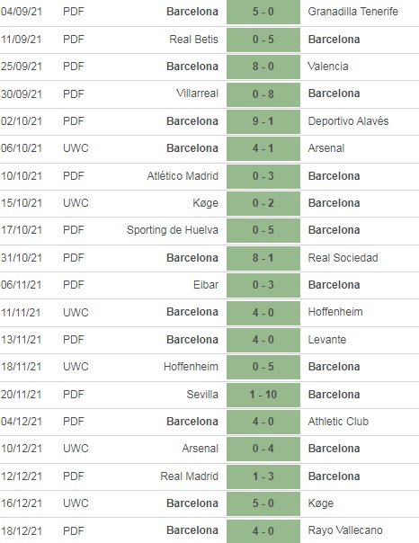 現在20連勝中のバルサ女子のスコアがこちら(Soccerwayより)。