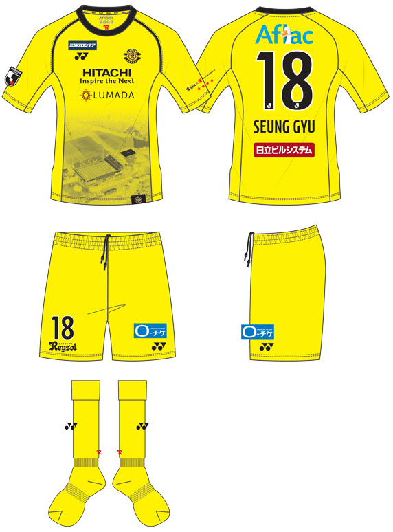 各部スポンサーは、胸に「HITACHI(日立)」、背中上に「Aflac(アフラック)」、背中下に「日立ビルシステム」、鎖骨右に「三協フロンテア」、パンツに「LAWSON」。