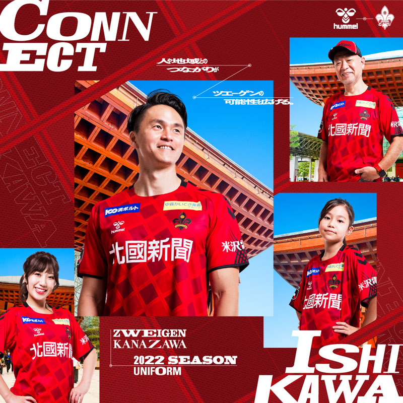 金沢駅の兼六園口にある「鼓門(つづみもん)」という、能の鼓の構造を模した重厚な作りが特徴な建造物。その鼓門を下から見上げた際の“格子柄”をグラフィックに採用。コンセプトもデザインも素晴らしいだけに、両鎖骨スポンサーの色が少々残念である。