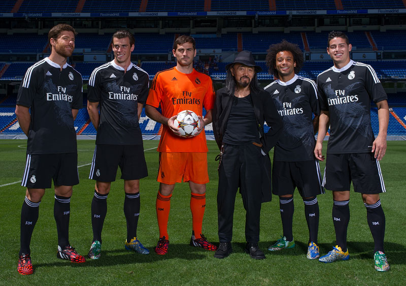 山本耀司氏とレアルの“コラボ原点”である14-15シーズンのサードユニフォーム。この時はY-3ではなくadidasからのリリースだった。画像は当時のユニ発表時の様子で、山本氏と選手が一緒に収まった貴重なショットだ。