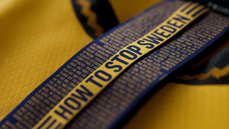 この新ユニフォームには「HOW TO STOP SWEDEN」として、なんと親切にも代表チームと選手の戦力分析データをプリントしたタブ付き。対戦国はユニフォームを買えばチームデータが手に入るという、何とも挑戦的で商売上手なユニである。
