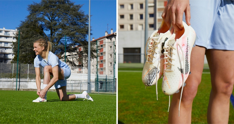 シャーシ、ヒールカウンター、ミッドソールプレート、アッパーは、製品生産中に発生した廃棄物を活用した再生素材を100%使用。新しい素材を使うことだけが世界最高のサッカー選手に最高のパフォーマンスを提供し躍進させてくれる、という既存の概念を裏切るスパイクとなっている。