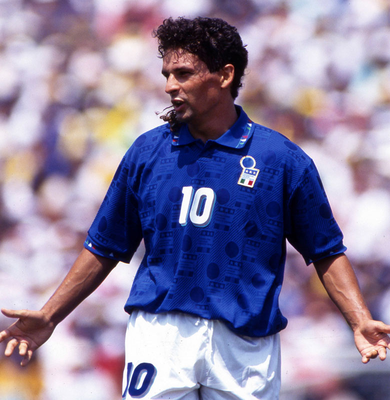 決勝戦でPKを失敗したロベルト・バッジョの、哀愁漂う後ろ姿の記憶と共にあるユニフォーム。1994W杯モデルは透かしプリントが印象的なDiadora時代の名作である。イタリアサッカー連盟の方針で、当時は右胸にサプライヤーロゴを入れていなかった。