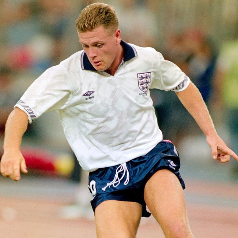 1990年イタリア・ワールドカップで使用した1990モデル。このユニフォームといえば「ガッザ」の愛称で人気だったポール・ガスコインで、ヤング・スターの登場はイングランドサッカー界に明るい未来を予感させた。