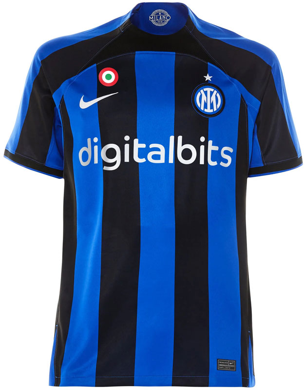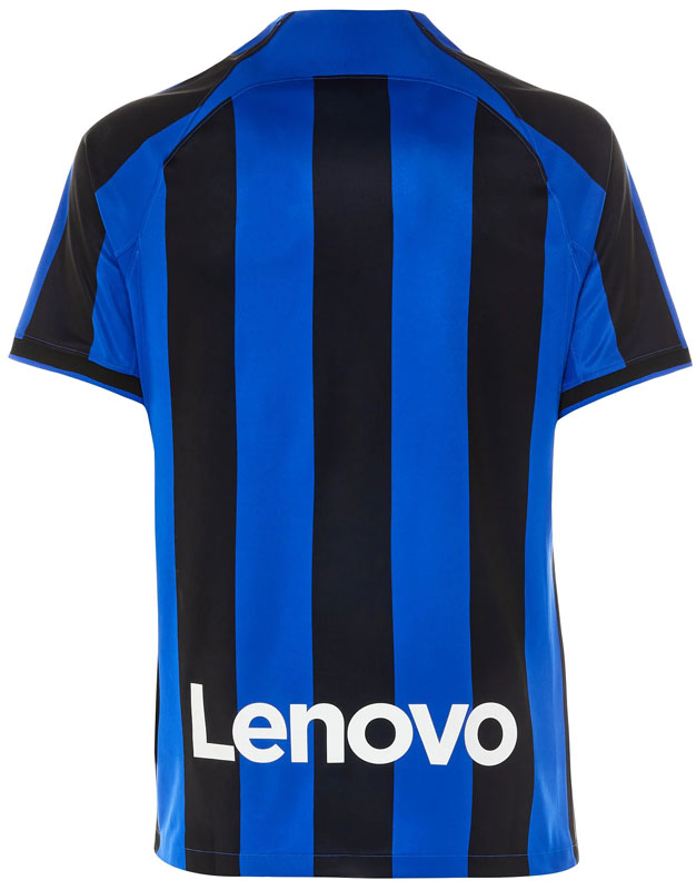 22-23新ホームユニフォームは、インテルの伝統的なネッラズーリ(黒と青)のストライプを採用。胸のスポンサーは、ローマと同じブロックチェーン企業の「Digitalbits」に変更となった。腰部分には「Lenovo」のロゴを掲出。