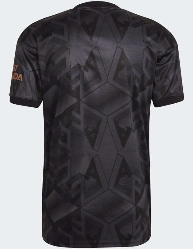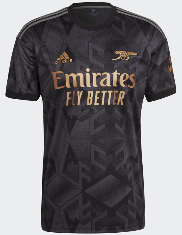 22-23新アウェイユニフォームは、クラブ名の略称“AFC”の立体的なロゴを散りばめるデザイン。本拠地エミレーツ・スタジアムのあるロンドン北部・イズリントン区で、サポーターがスタジアムに向かう姿に着想を得たデザインだという。