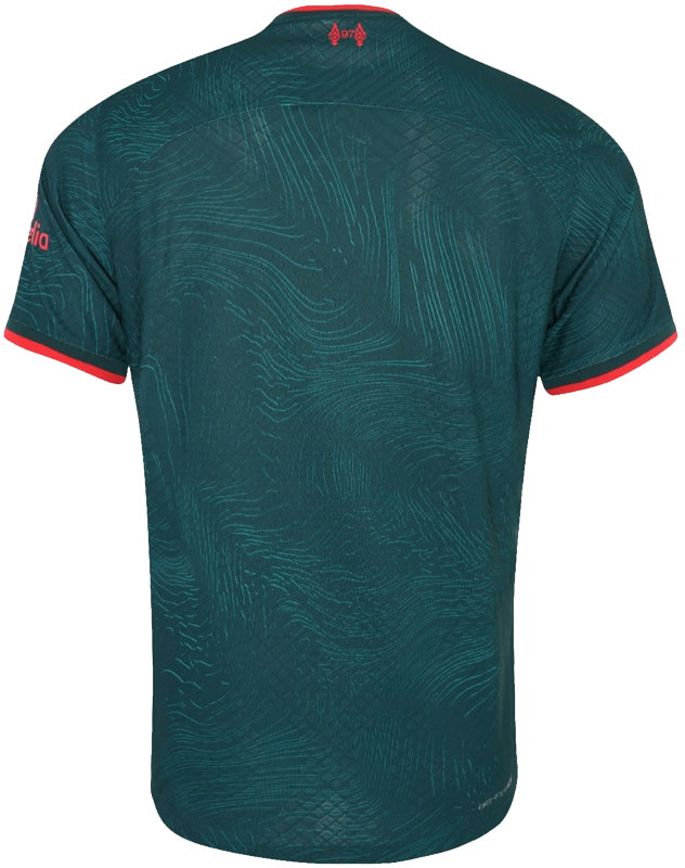 22-23新サードユニフォームは、グリーンを基調にレッドを組み合せたカラーコンビネーション。この基調色のグリーンはダークアトミックティールとリオティールという、Nikeの2つのグリーン系カラーをブレンドしたものだという。エンブレム、スポンサーロゴなどは明るめのレッド(サイレンレッド)で統一する。