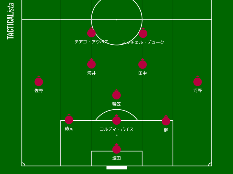 中盤はこの夏ブラウブリッツ秋田より迎え入れた輪笠祐士がアンカーに入り、インサイドハーフは右が豊富な運動量で攻守に貢献する田中雄大、左がバランサーの河井陽介という組み合わせ。ウイングバックは右が正確な右足が光る河野諒祐で、佐野航大がU-19日本代表のため離脱中の左はFW登録のハン・イグォンと両サイドに対応する成瀬竣平が起用されている。