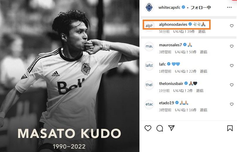 当時のチームメイトである現バイエルンのカナダ代表アルフォンソ・デイヴィスも合掌の絵文字で彼の死を悼んだ。