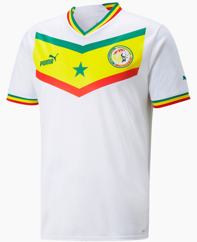 2022新ホームユニフォームは定番のホワイトを基調とし、今回は久々に国旗カラーを強く押し出したデザイン。国旗3色でライオンの横顔を描いた2017モデルよりもセネガルという国を感じさせるユニフォームだ。