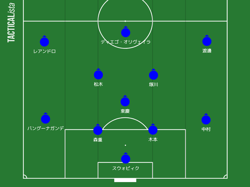 3トップは右ウィングが中盤やサイドバックでも機能する渡邊凌磨、左は打開力に優れるレアンドロで、積極果敢なドリブラーの紺野和也と得点源として力強くけん引したアダイウトンも名を連ねる充実のセクション。