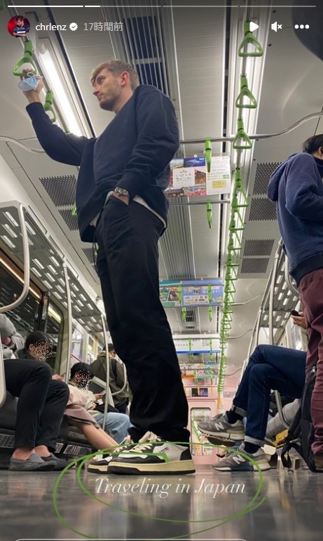 日本を旅して、というコメントとともに電車に乗る姿を披露。割と馴染んでいるが、山手線だろうか。