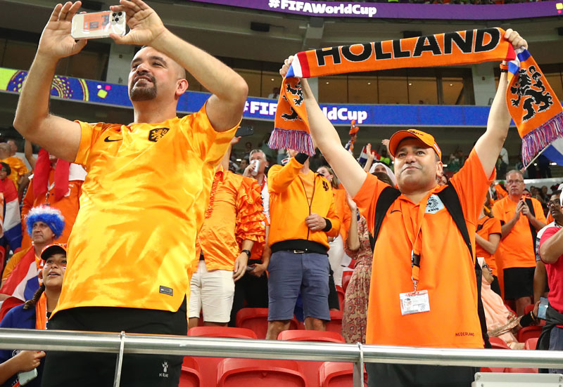オランダサポはユニフォームやポロシャツなど、わりとレトロウェアの着用率が高めの印象。右の男性が着ているのは、大きな襟とクラシックなデザインが素晴らしい2006ドイツW杯モデルだ。