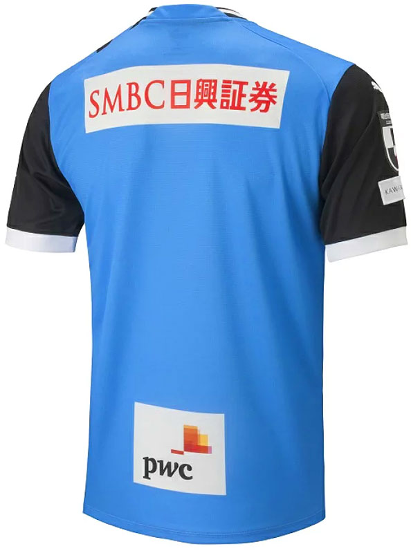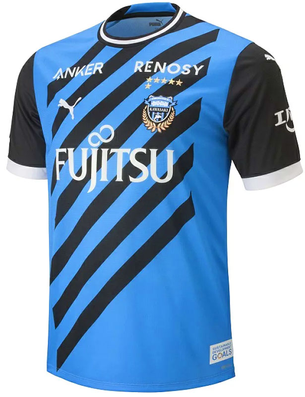 “前面のみストライプ”のデザインで、「常に最前線で挑戦し続け、正面から正々堂々と戦う」チームの姿勢を表現。7本のストライプには、クラブの根源である川崎市7区(川崎区、幸区、中原区、高津区、宮前区、多摩区、麻生区)を重ねる。