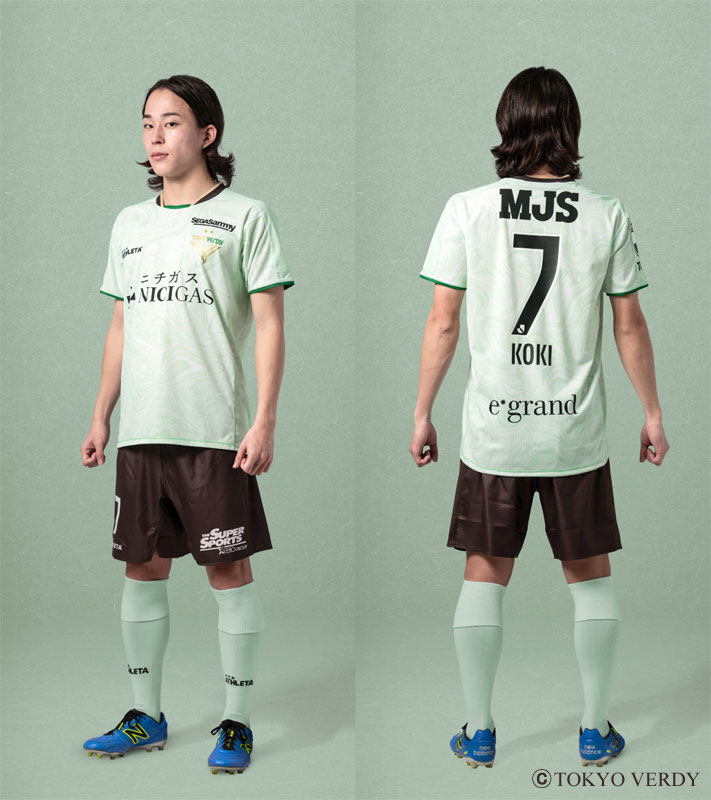 首のリブとパンツにはダークブラウンを採用し、どことなくミントチョコレートのような色のコンビネーション。そんな意外性のある2色で東京らしいモダンなスタイルを展開する。首中央と袖先のグリーンの切替え、首のゴールドラインがヴェルディらしい。