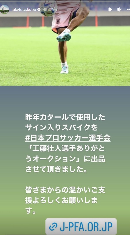 僕はカタールワールドカップスペイン戦で使用したスパイクをサイン入りで出品いたしました。工藤選手のご家族をサポートするためにご協力よろしくお願いします。#JPFAオークション@JPFA_NEWS https://t.co/6zP7NRPoA5 pic.twitter.com/lXnsPoNkrn