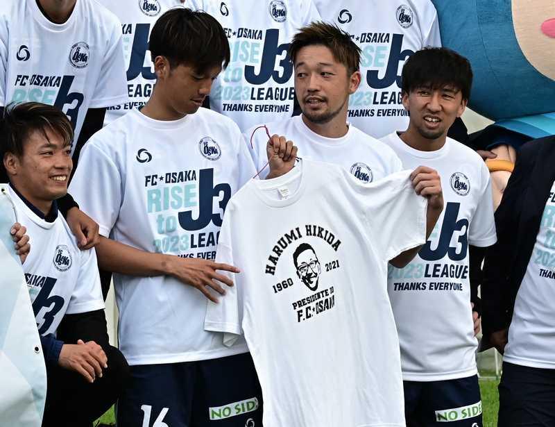 スタジアムには今も疋田晴巳前社長のフラッグが出され、J3昇格決定時の記念撮影でも顔写真とTシャツが掲げられた。チームを成長させた恩人への感謝が表されている。