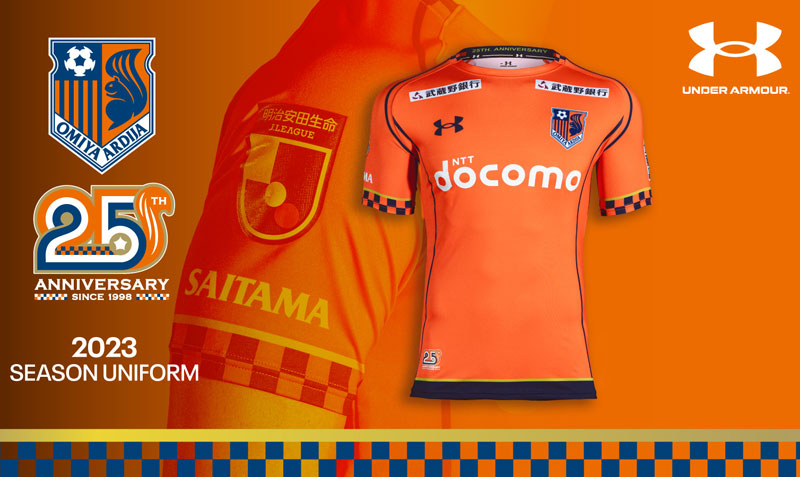 2023シーズンでクラブ創立25周年を迎える大宮。2023ユニフォームはシンプルなオレンジベースに、市松模様のブロック柄を襟と袖口にデザイン。その上部には記念すべき25周年シーズンを祝したゴールドのラインを走らせる。