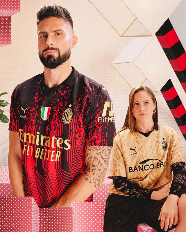 おそらくはオーセンティックモデルのみのと思われるが、ユニフォームは同じピクセル柄のボックスに収納。カバーにはPuma、ミラン、Kochéのロゴを配した特別デザインだ。