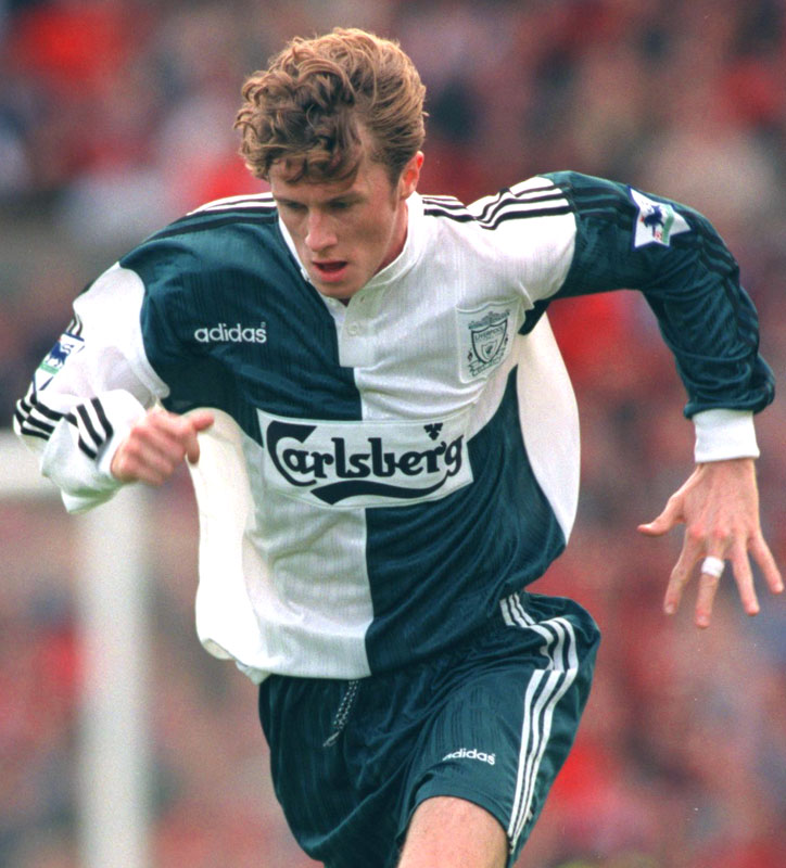 23-24シーズンのアウェイキットが4分割デザインと噂されるリヴァプール。95-96アウェイでは初期のデザインをイメージしたこのスタイルを採用していた。薄っすらと走らせる透かしストライプがオシャレなデザインだ。