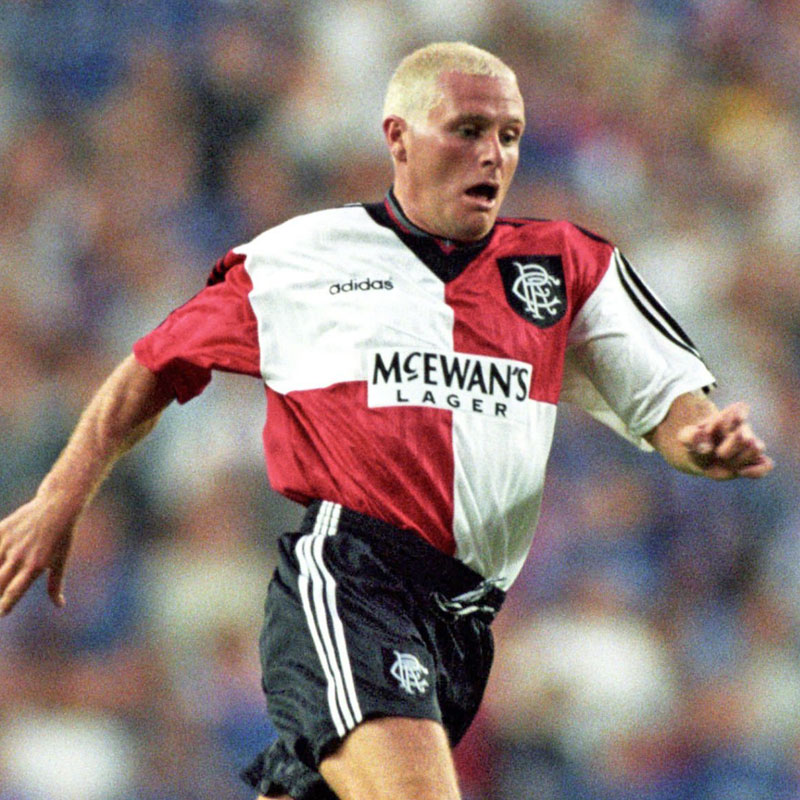 ストライプ、斜め2分割、たすき掛けなど、様々なスタイルを使い分けるレンジャーズ。95-96シーズンのアウェイでクラブ史上初めて赤白の4分割を採用した。ちなみにレンジャーズがこのスタイルを使ったのは、95-96と16-17の2シーズンのみである。