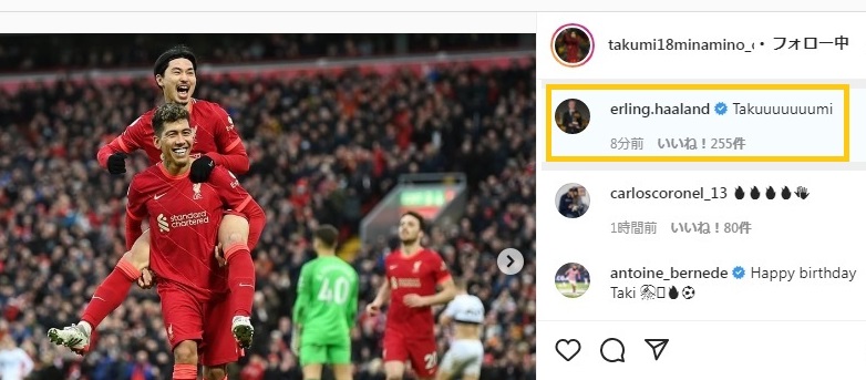 南野がリヴァプール時代の27歳の誕生日にゴールを決めた際には「Takuuuuuuumi」とのメッセージを送っている。