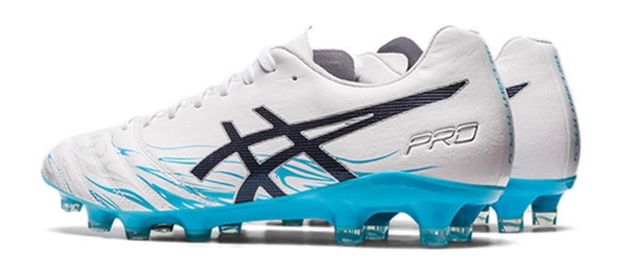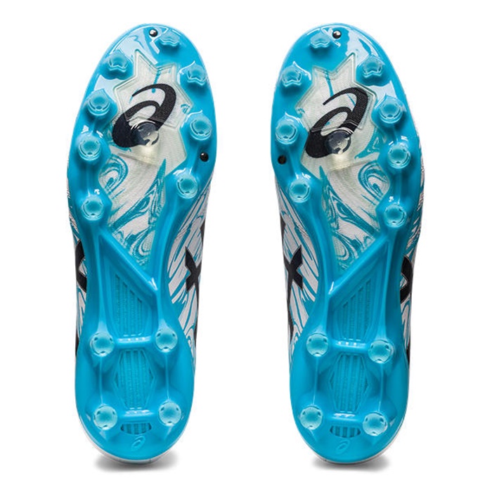 つま先部分にはグリップ性に優れた変形円柱型スタッド+ブレード型サブスタッドを採用し、スプリント時のパワーロスを抑制する。